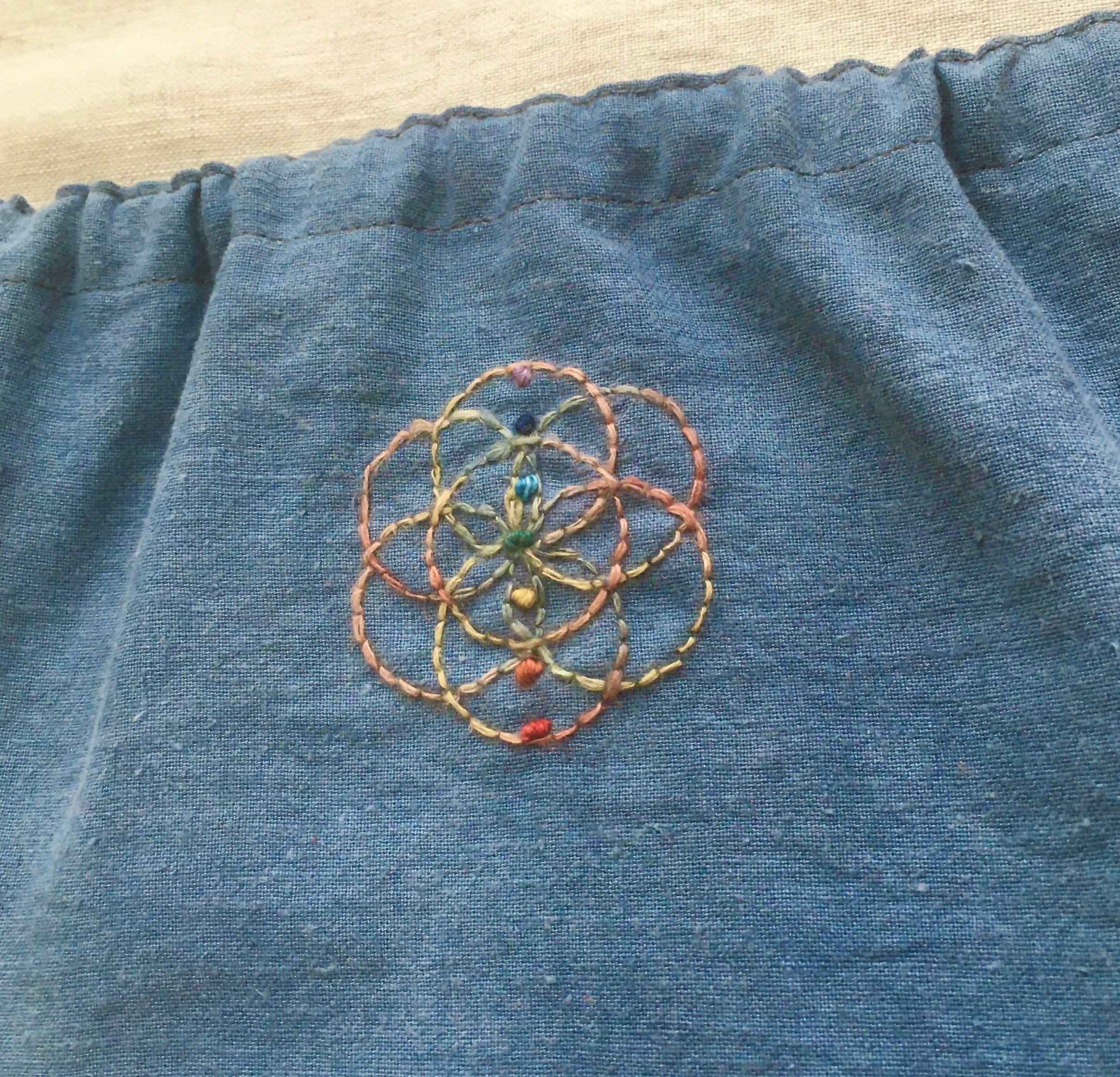 ◎フロントには、シードオブライフ模様の刺繍し、チャクラカラーをプラスしています。