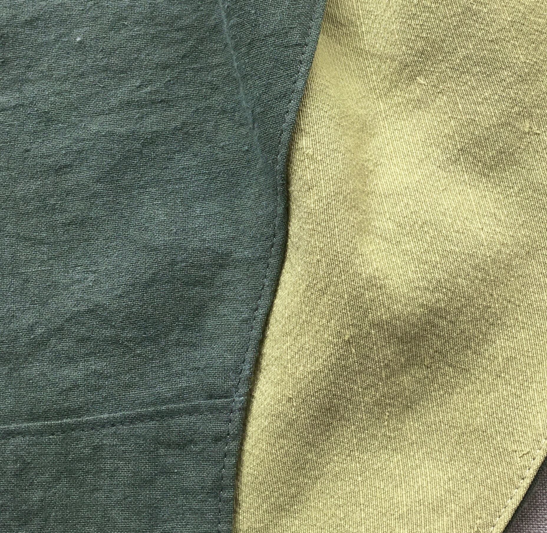 ◎表側の生地は、ヘンプコットン/藍錠染め、べんがら染め(グリーン系)